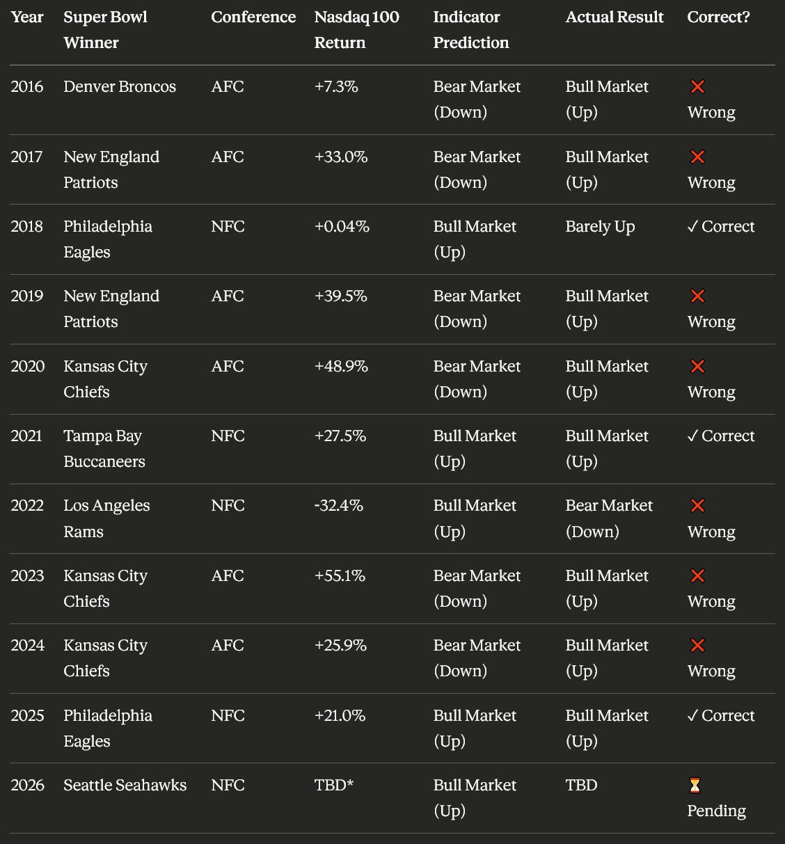 The Seahawks’ NFC victory predicts a bull market for 2026. We’ll revisit this at year-end to see if the indicator finally gets one right—though based on the past decade, don’t bet your portfolio on it.